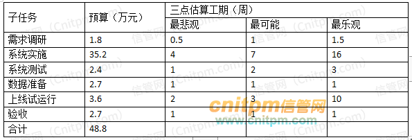 某公司拟建设一个门户平台,根据工作内容,该平台项目分为需求调研、系统实施、系统测试、数据准备(培训)、上线试运行、验收六个子任务,各子任务预算和三点估算工期如下表所示。