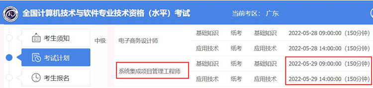 广东2022年上半年系统集成项目管理工程师考试时间为5月29日,有关考试科目及具体时间安排如下: