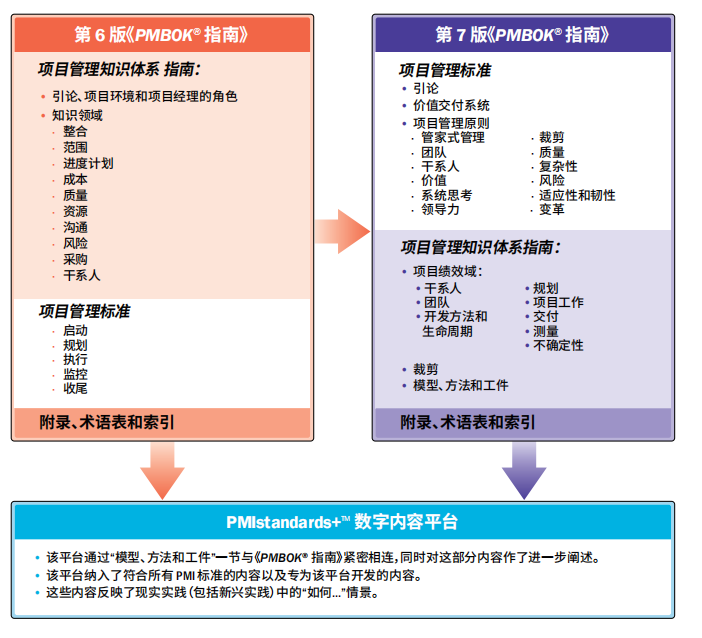 第七版包括两大部分,第一部分是项目管理标准,第二部分是项目管理知识体系指南。第七版将独立的《项目管理标准》部分放在最前面论述,此次变化考试可能更加关注和强化项目管理的标准化之意。项目管理标准部分又分为两部分,分别是价值交付系统和项目管理原则。项目管理知识体系指南包含三部分,分别是8大绩效域,剪裁以及158个工件、模型和方法。在最新版中,从传统的五大过程组与十大知识领域转向了全新的十二大原则与八大绩效域。