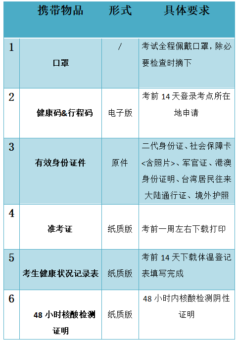 2.考虑到防疫检测要求,请考生提前安排出行时间,原则上应在开考前一个半小时到达考点,配合防疫相关检测。考生需自备一次性医用外科口罩并按规定或监考人员要求全程佩戴医用外科口罩,仅可在身份验证时摘下,如有不戴后果自负。