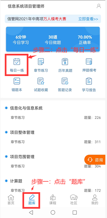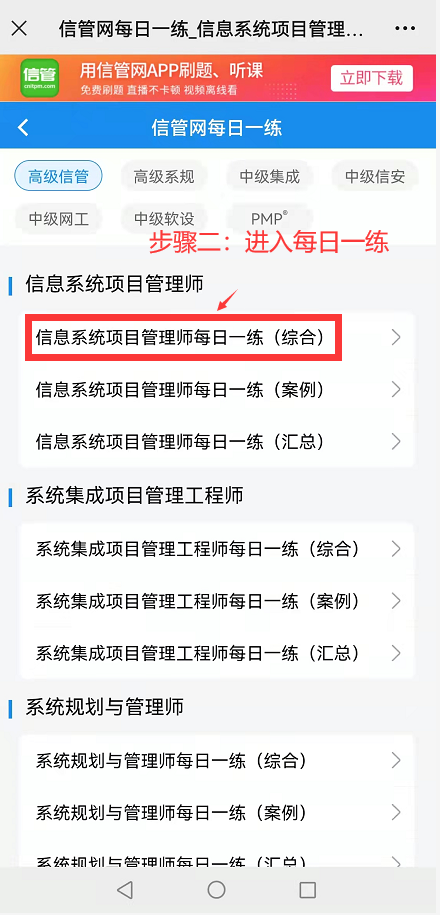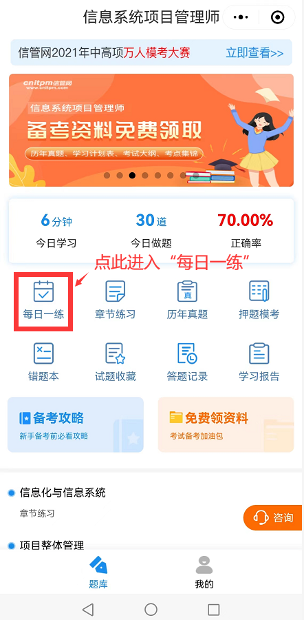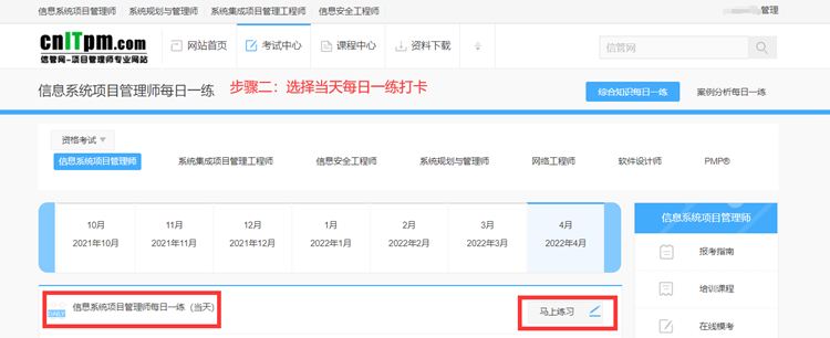 步骤二:选择所需考试(默认为:信息系统项目管理师),点击“马上练习”