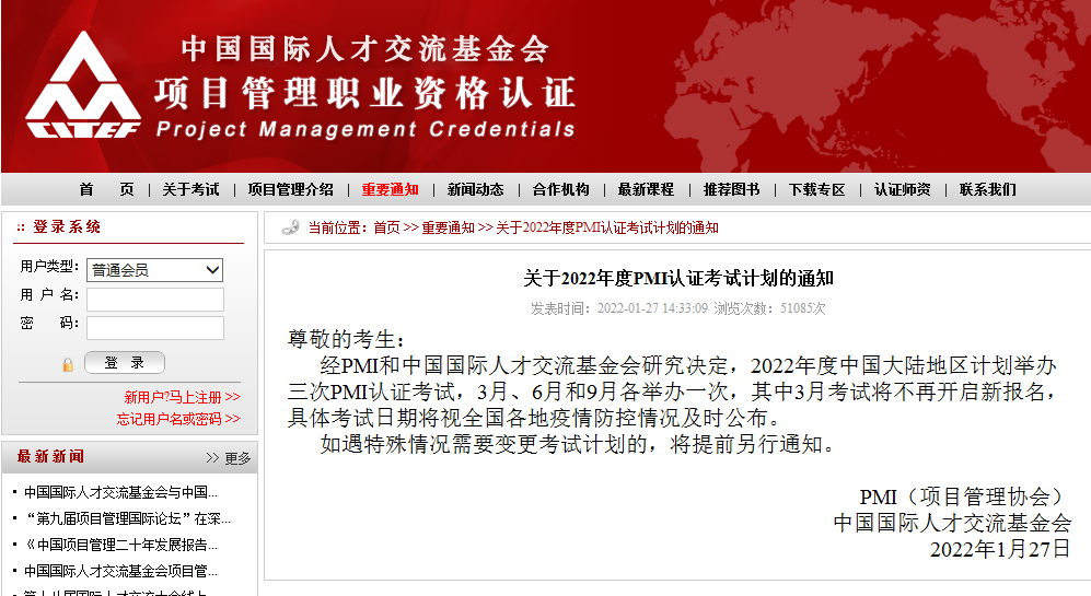 经PMI和中国国际人才交流基金会共同研究决定,2022年中国大陆地区考试共举办三次,分别在3月、6月和9月,其中3月份为2021年推迟的考试,因此不再开启报名。