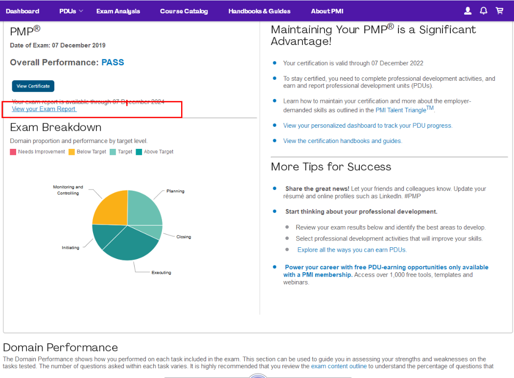 5、在认证页面的My PMP®下面点击Exam Report(s),就可以下载成绩单。