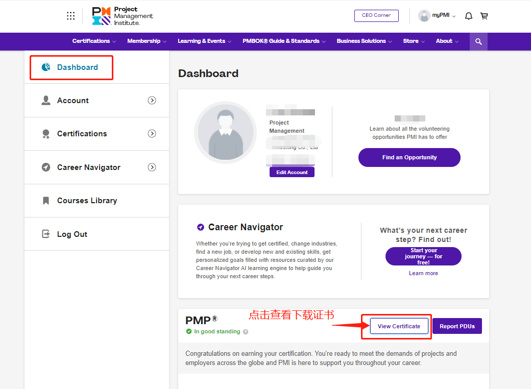 6、在认证页面的My PMP®下面点View Certificate,最后即可看到PMP®证书的PDF文件,可打印PMP®证书。