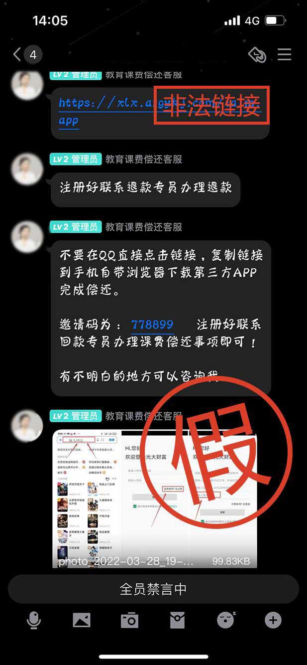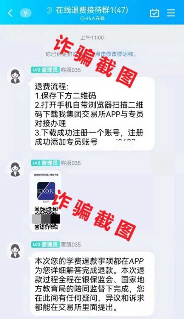 添加好友或者进群后,不法分子会伪装成退费客服专员,贴出伪造的信息、文件骗取学员信任。比如”本次您的学费退款事项都在APP为您详细解答完成退款。本次退款过程全程在银保监会、国家地方教育局的陪同监督下完成,您在此间有任何疑问、异议和诉求都能在交易所里面提出“。