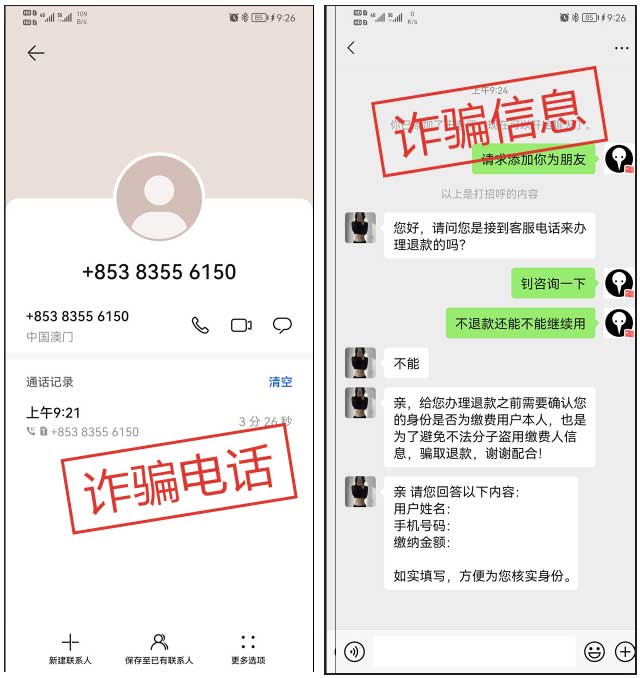 利用香港或澳门电话(区号00852、00853、+852、+853)来电联系教培机构学员,谎称自己为客服人员,以各种理由为学员办理退款,并诱导学员添加好友或加入QQ群。随后,诱导学员下载第三方APP,谎称退款必须要在指定APP内完成,诱导学员注册并获取银行卡、验证码等重要信息,进行诈骗。
