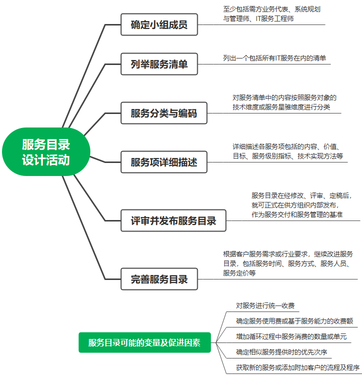 ①发布服务目录②服务项详细描述③服务分类与编码④列举服务清单⑤确定设计小组成员⑥评审服务目录