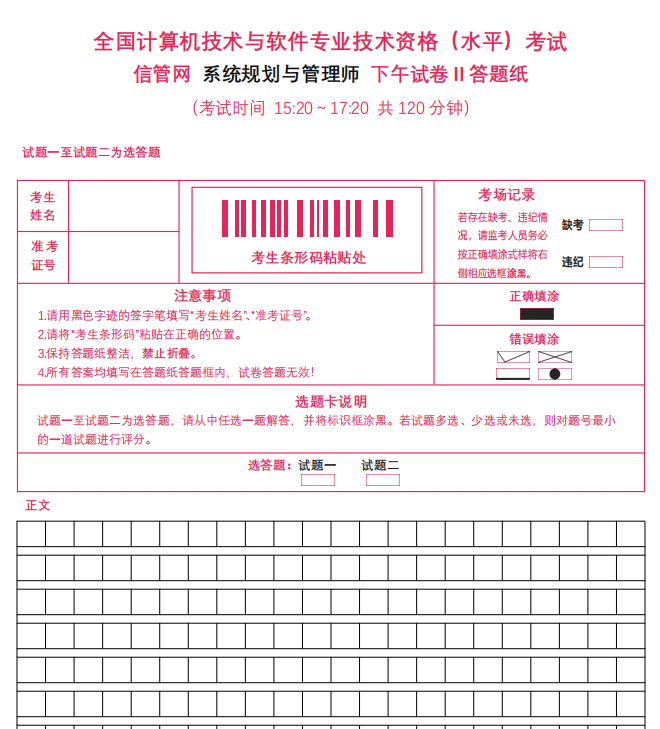 2023年系统规划与管理师考试将于5月27日举行,为让各位考友能以考试的状态来备考论文,JRS直播特提供2023版系统规划与管理师论文答题练习纸,该论文答题练习纸以系统规划与管理师论文真题答题纸为样本进行制作,大家可以下载后打印并练习。