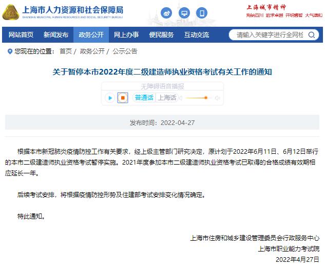 通过上海市职业能力考试院官网了解得知,原定于2022年6月11日、6月12日举行的上海二级建造师职业资格考试暂停实施,具体考试时间安排将根据疫情防控形势及住建部考试安排变化情况确定。