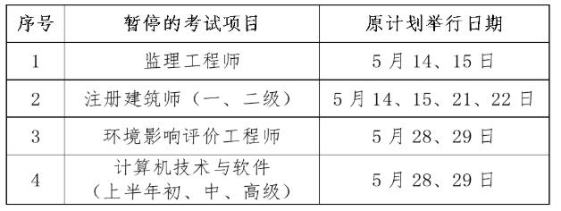 根据新冠肺炎疫情防控工作有关要求,为确保广大应试人员生命安全和身体健康,经研究决定,暂停上海地区原计划于2022年5月举行的监理工程师、注册建筑师(一、二级)、环境影响评价工程师、计算机技术与软件(上半年初、中、高级)等4项全国专业技术人员职业资格考试。