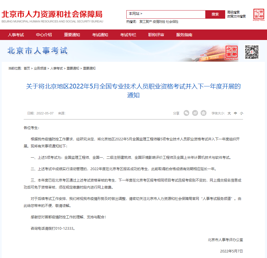 关于将北京地区2022年5月全国专业技术人员职业资格考试并入下一年度开展的通知
