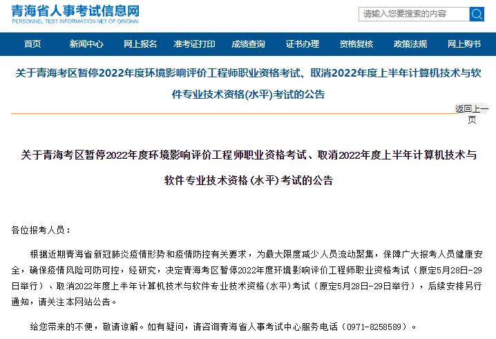 根据近期青海省新冠肺炎疫情形势和疫情防控有关要求,为最大限度减少人员流动聚集,保障广大报考人员健康安全,确保疫情风险可防可控,经研究,决定青海考区暂停2022年度环境影响评价工程师职业资格考试(原定5月28日-29日举行)、取消2022年度上半年计算机技术与软件专业技术资格(水平)考试(原定5月28日-29日举行),后续安排另行通知,请关注本网站公告。