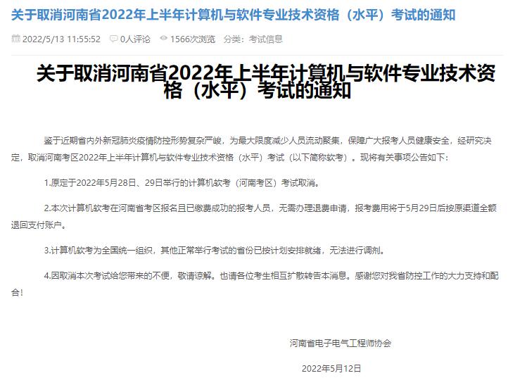 关于取消河南省2022年上半年计算机与软件专业技术资格(水平)考试的通知