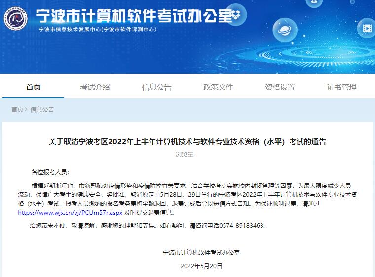 根据近期浙江省、市新冠肺炎疫情形势和疫情防控有关要求,结合学校考点实施校内封闭管理等因素,为最大限度减少人员流动,保障广大考生的健康安全,经批准,取消原定于5月28日、29日举行的宁波考区2022年上半年计算机技术与软件专业技术资格(水平)考试。报考人员缴纳的报名考务费将全额退回,退费完成后会以短信方式告知。为保证顺利退费,请通过 https://www.wjx.cn/vj/PCUm57r.aspx 及时提交退费信息。