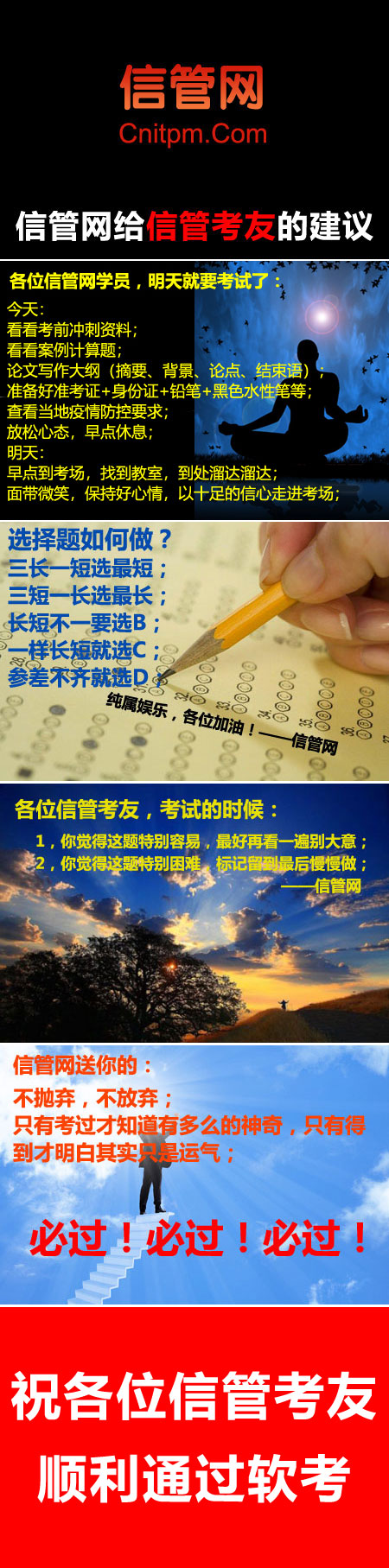 “考前焦虑”不可避免,但不要过度紧张,放松心情,从容赴考!良好的应考情绪是我们正常发挥乃至超常发挥的重要条件之一。