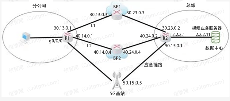 图为某公司的总部和分公司网络拓扑,分公司和总部数据中心通过ISP1的网络和ISP2的网络互连。并且连接5G出口作为应急链路,分公司和总部数据中心交互的业务有语音、视频、FTP 和 HTTP 四种。要求通过配置策略路由实现分公司访问业务分流。配置网络质量分析(NOA)与静态路由联动实现链路冗余。其中,语音和视频以ISPI为主链路、ISP2为备份:FTP和HTTP以ISP2为主链路,ISP1为备份。