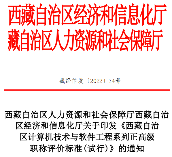 很多考生知道通过软考高级考试可以拿到高级职称,但只是副高职称,怎么才能取得正高职称呢?对此西藏西藏自治区经济和信息化厅发布了相关通知——厅关于印发 《西藏自治区计算机技术与软件工程 系列职称评审办法(试行)》的通知。如有意申报正高级职称的小伙伴可以了解了解。