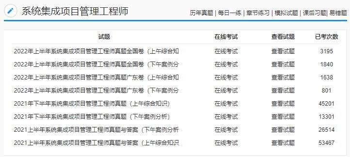 JRS直播提供了系统集成项目管理工程师考试报名、考试培训、考试资讯、真题发布、资料下载、习题练习、企业内训等服务,组织编写了多本考试辅导书籍。目前JRS直播设置有“考试中心”栏目,为广系统集成项目管理工程师考生免费提供每日一练、章节练习、历年真题、模拟试题等相关服务,考生可根据需求进行选择。