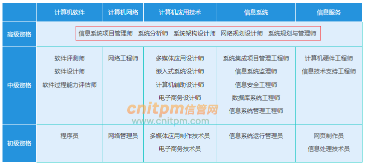 软考高级一共有五个资格项目,分别是信息系统项目管理师、系统分析师、系统架构设计师、网络规划设计师、系统规划与管理师,如下图所示: