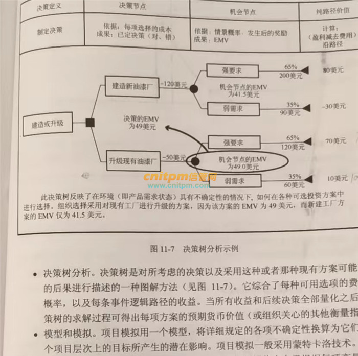 定量风险分析是项目经理或项目工作人员通过一些数学方法和统计工具所进行的项目风险分析。常用的定量分析工具有:(1)决策树,用来根据期望值评估替代性行动过程;(2)净现值(NPV)统计,用来评价项目的现金流风险;(3)项目评审技术(PERT)和PERT仿真,检查活动和项目风险。PERT仿真更加常用是因为其所需的数据与PERT相同,但其可通过仿真的办法得到。