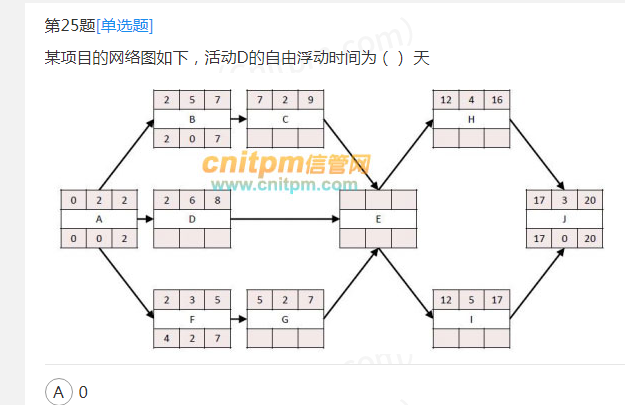 自由浮动时间"是指在不延误任何紧后活动的最早开始时间且不违反进度制约因素的前提下,活动可以从最早开始时间推迟或拖延的时间量。其计算方法为:紧后活动最早开始时间的最小值减去本活动的最早完成时间。所以D的自由浮动时间=9-8=1