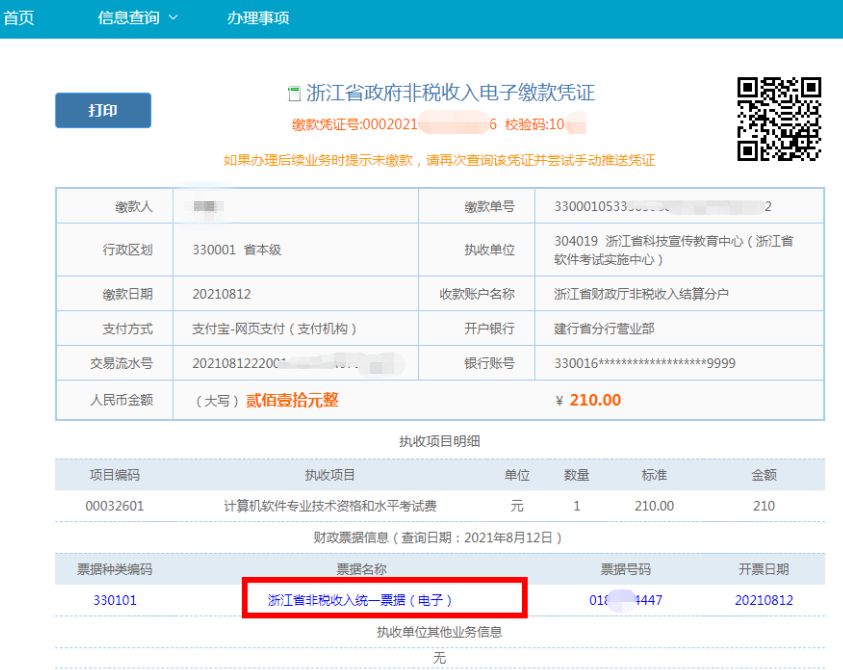 全国计算机技术与软件专业技术资格(水平)考试(浙江考区)考试费发票统一由浙江政务服务网公共支付平台开具,在缴费完成后出现的“浙江省政府非税收入电子缴款凭证”窗口下可直接点开打印“浙江省非税收入统一票据(电子)”。