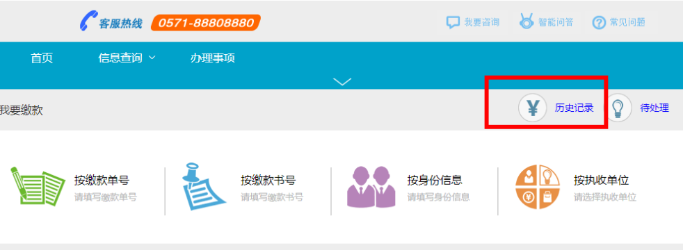 步骤二:点击“历史记录”,在“缴款单号”处输入单号,点击“查询”。缴款单号来源:“中国计算机技术职业资格网”报名网站中“网上缴费”栏目下的“查票单号”。