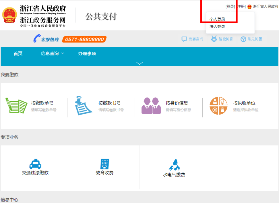 步骤一:打开浙江政务服务网公共支付平台(https://pay.zjzwfw.gov.cn/),点击右上角的登录按钮,使用个人浙江政务服务网账号登录系统。