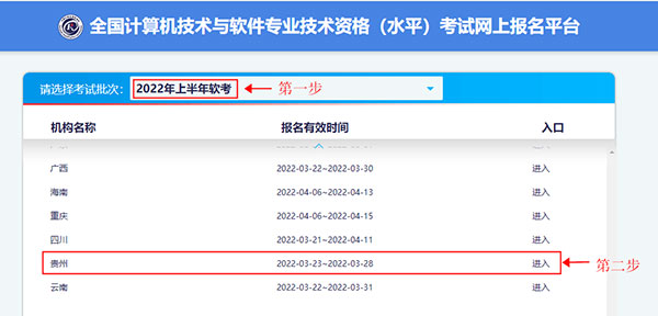1.打开全国计算机技术与软件专业计算资格(水平)考试网上报名平台,选择“2022上半年”点击“考试报名”进入“贵州”报名入口,输入用户名和密码,登录系统。