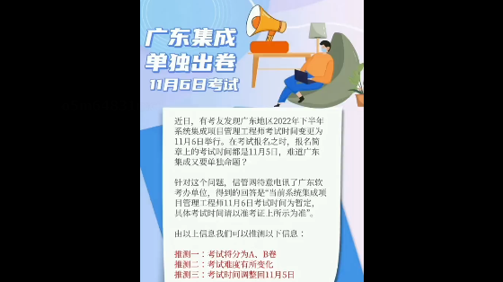 广东系统集成项目管理工程师考试时间变更为11月6日,难道又要单独命题了?针对这个问题,JRS直播特意电讯了广东软考办单位,得到的回答是“当前考试时间为暂定,具体考试时间请以准考证上所示为准”。