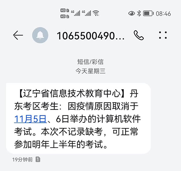 短信提醒:【辽宁省信息技术教育中心】丹东考区考生:因疫情原因取消于11月5日、6日举办的计算机软件考试。本次不记录缺考,可正常参加明年上半年的考试。