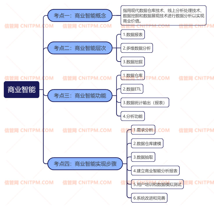 商业智能是系统集成项目管理工程师信息化知识中的考点内容,位于系统集成项目管理工程师教程中(第2版)的第1章中【点这里购买官方正版教程】。在近三年的考试中,商业智能总共出现过4次,分别在2022年下半年、2022年上半年、2021年下半年、2021年上半年,出题频率还是非常高的,考题方向主要包括“商业智能概念”、“商业智能层次”、“商业智能功能”以及“商业智能实现步骤”几个方面,题目难度不大,均为概念记忆型题目,要求考生掌握。