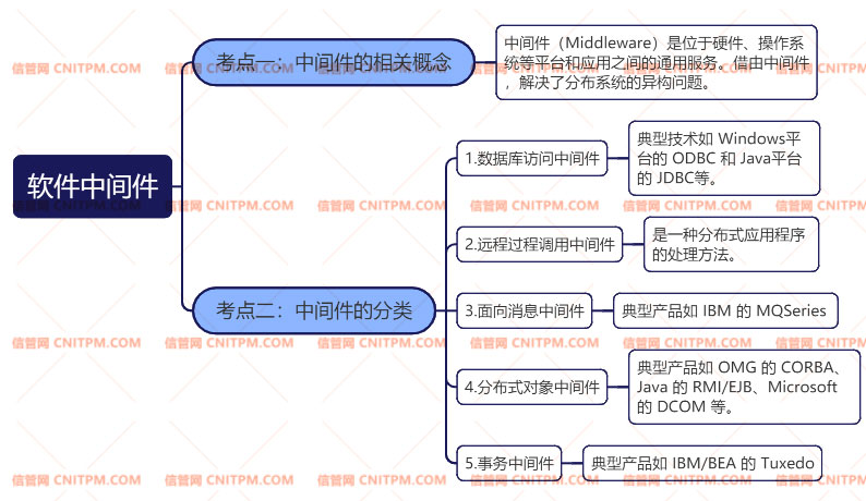 软件中间件是系统集成项目管理工程师信息化知识中的考点内容,位于系统集成项目管理工程师教程中(第2版)的第3章中【点这里购买官方正版教程】。在近三年的考试中出现过两次,分别是2022年上半年和2020年下半年,出题范围主要围绕“中间件分类”进行,主要考察考生对于中间件各类别概念和典型技术的熟悉程度,整体难度不大。