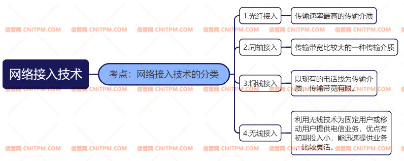 网络接入技术是系统集成项目管理工程师信息化知识中的考点内容,位于系统集成项目管理工程师教程中(第2版)的第3章中【点这里购买官方正版教程】。在近三年的考试中仅在2022年上半年出过题,出题频次并不高,考试内容主要围绕“网络接入技术的分类”,考察考生对于各类别的熟悉程度,均为概念题,考试难度不大。