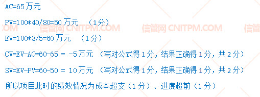 问题:假设项目总成本为100万,按进度计划平均分摊到项目活动中。工程执行到第40天结束,项目经理发现已经完成了3/5的工作量,花费的成本为65万元。请计算项目的成本绩效和进度绩效,并说明项目此时的绩效情况。