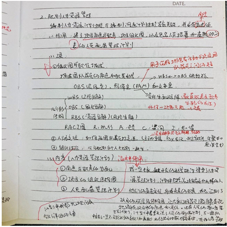 4、论文的准备:由于我没有完整的大型项目管理的经验,开始也很担心论文,但按照老师说的,先把开头结尾准备好,这都是每篇论文通用的。大概在2月份的时候,我开始了论文准备,先找了工作中实际参加的一个项目,按照范文的示例打磨出了开头结尾。十大过程每一课讲完消化后,根据倪老师说的,试着写一篇论文。我是先研究了辅导资料上给的范文,再到JRS直播看往期的论文课程,根据论文课程讲的方法,把论文的框架搭好。具体内容就是先描述每个子过程的概念和作用(这部分内容背的,写的比较专业化),再写过程中使用的技术方法(大部分都用了倪老师说的万金油技术,邀请专家干系人开会研讨等等),再举例(例子基本上都是我在平时工作中用过的,写得也比较口语话)。有一些过程实在想不到合适的例子,我就在论文提交中向老师提问,老师们也给了合适的建议,我再补充好后提交批改。