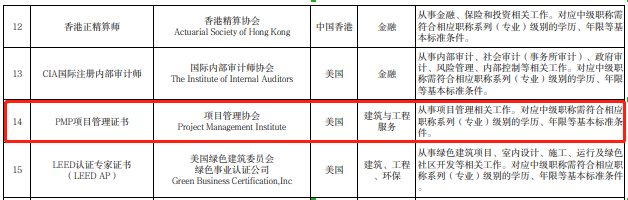 北京人社局发布了《北京市境外职业资格认可目录(3.0版)》,PMP证书在目录之中,持证人员与在京单位建立人事劳动关系可办理工作居住证,对应中级职称。