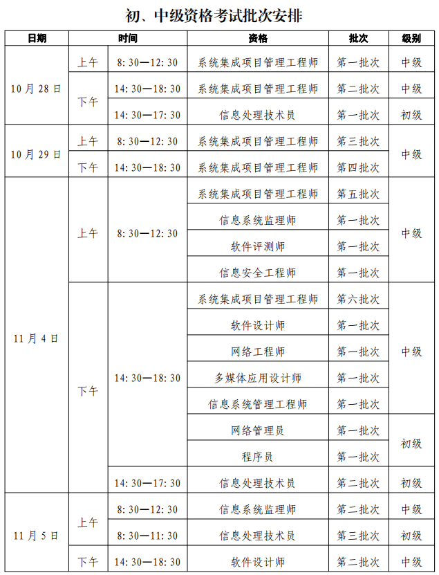 信息系统项目管理师、系统集成项目管理工程师、信息处理技术员、软件设计师、信息系统监理师5个资格考试因报考人数较多,为确保报考人员均有机位可考,部分考区将对上述5个资格考试采取分批次实施的办法,请各位考生及时关注当地计算机软件资格考试办公室的通知,按准考证上的时间、地点和批次参加考试,也请广大考生对此予以理解和支持。