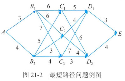 【试题】计划从A地铺设一条输油管道到E地,中间须经过三个中间站。第一个中间站可设在B₁或B₂,第二个中间站可以有C1、C2、C3三种选择,第三个中间站可取D1或D2。各地之间的距离(单位为km)标在箭线旁边,如图21-2所示。要求确定一个方案,使得从A到E的距离最短。