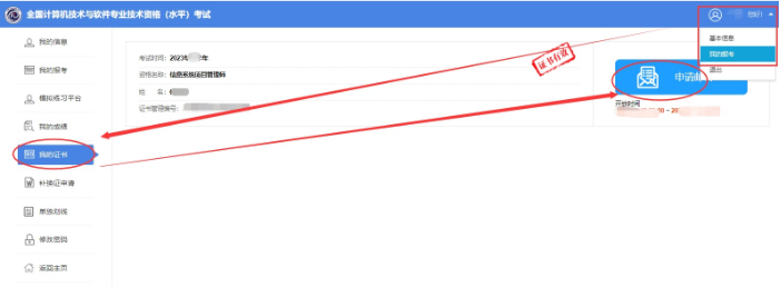 (2)点击网站右上角的个人中心,进入“我的报考”界面,点击“左侧“我的证书”——点击“申请邮寄”。