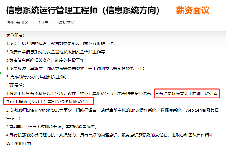 从其他方面来说,不同的公司,即使是相同的岗位,其工作要求、工作内容也是不同的,如果想要了解信息系统管理工程师是干什么的,最好的方法便是去各大招聘网站上看看信息系统管理工程师这个职位的相关描述,,当然一般情况下,招聘公告上写的跟你去公司之后做的不一定相同,所以想要具体了解信息系统管理工程师是干什么的,只有自己去从事相关的工作才能体会。