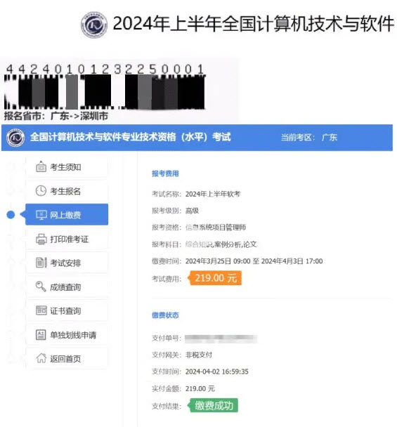 根据“44240101232250001”这段数字预估的,44应该是代表“广东”,2401代表的应该是“24年上半年”,末尾的0001代表的应该是“系统识别号”,然后剩下中间的数字代表的应该是“考生报名时的序号”,也就是说“0123225”代表着这位考生是第123225个报名的,由于该考生是卡着4月2日16:59分报名缴费的,所以可以预估广东2024年上半年软考报名人数为12万多。当然这些都是个人猜测,不一定正确!!!