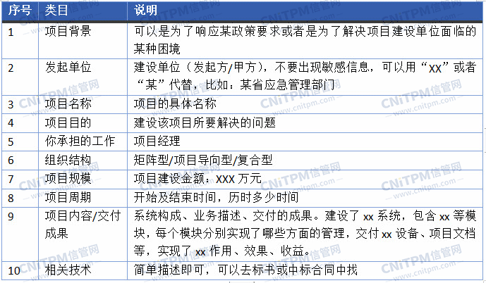答:其实你大家去看一下历年的论文真题就会发现,题目的第一个要求基本上就是——“概要叙述你参与管理过的一个信息系统项目(项目的背景、项目规模、发起单位、目的、 项目内容、组织结构、项目周期、交付的成果等),并说明你在其中承担的工作(项目背景要求本人真实经历,不得抄袭及杜撰)。”