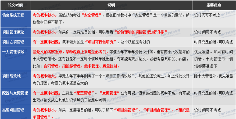 根据《信息系统项目管理师考试大纲》(2022年审定通过版),论文考察范围是大纲中“考试科目 1:信息系统项目管理综合知识”中”5.信息系统工程“至”20.高级项目管理“。