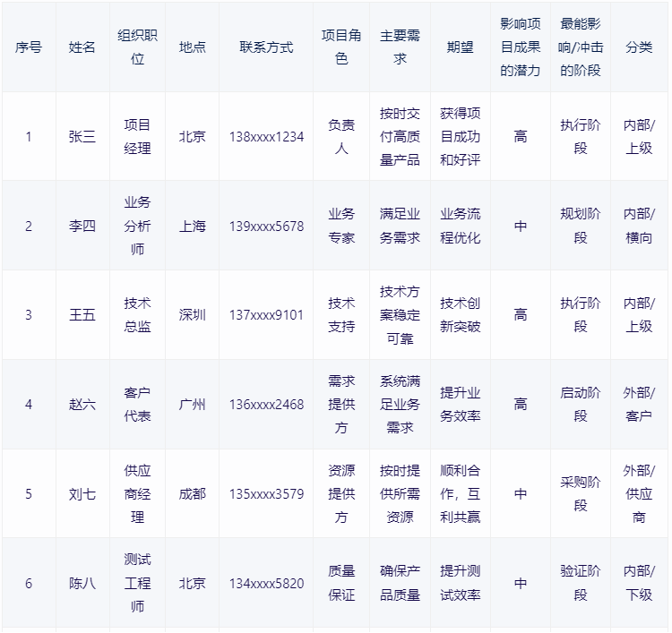•身份信息:姓名、组织职位、地点、联系方式,以及在项目中扮演的角色。