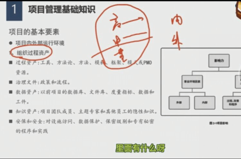 这里面我们来说就是内外部的运行环境。第一个大家要掌握的就是组织过程资产啊,组织过程资产这个呢,后面再讲十大领域在学大家在学十大领域的时候,其实都有学过,里面有什么呀?很多的过程的输入都有组织过剩资产。