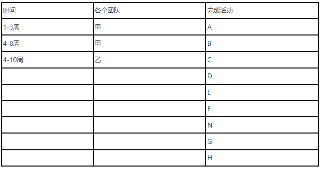 3.假设安排两个团队共同完成项目,每个团队能够独立完成任意活动,一项活动只能由一个团队完成,每个团队同一时间只能执行同一项活动,并且活动开始后,团队必须持续到活动结束,才能执行其他活动,请问项目是否能按照新的计划时间按时完工,请继续完成下表的填写(15分)