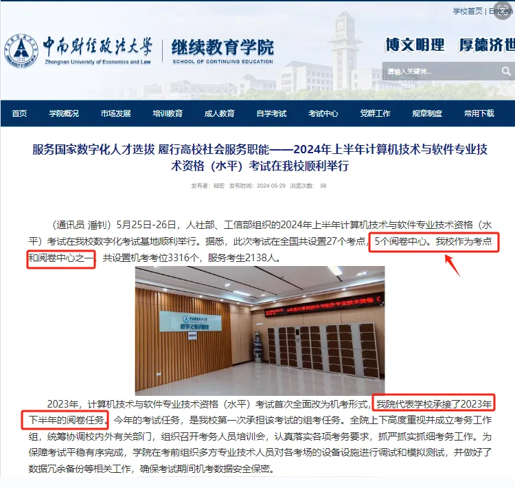 小编近日在中南财经政法大学继续教育学院官网看到一篇文章《服务国家数字化人才选拔 履行高校社会服务职能——2024年上半年计算机技术与软件专业技术资格(水平)考试在我校顺利举行》,其中有提到,全国共设置5个阅卷中心,只不过不知道说的是否正确,因为它前面还有一句“此次考试在全国共设置27个考点”,这个好像不对吧?全国应该不止27个考点,所以小编也不是很确定。