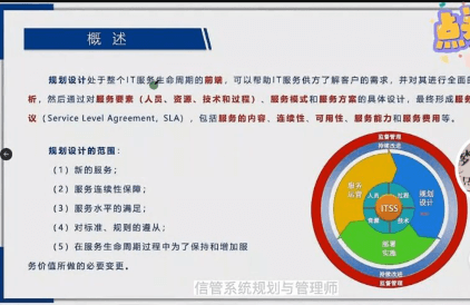 那我们说规划设计处于整个it服务生命周期的前端。但是我们在这里可以看到,你像规划设计和部署实施,这里有个交接点啊,这里是个交接点,看上去它好像是一个循环的过程,这个是为什么呢?这个就会涉及到规划设计的范围,那我们说比如说我新我作为服务供方而言,我新接了一个运维项目,那我肯定要做规划设计?所以新的服务肯定要做规划设计,包括说服务连续性保障我的服务能力能不能满足这个SLA对吧?服务水平的过足,还有我对一些ITSS itel corby等这些标准和规则的遵守。