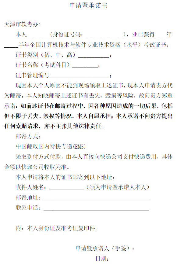 3.申请内容:将本人身份证正反面照片及申请暨承诺书(见附件,此承诺书须本人手写签字)发送至软考办邮箱:tjrkb@163.com,审核通过后逐一邮寄;